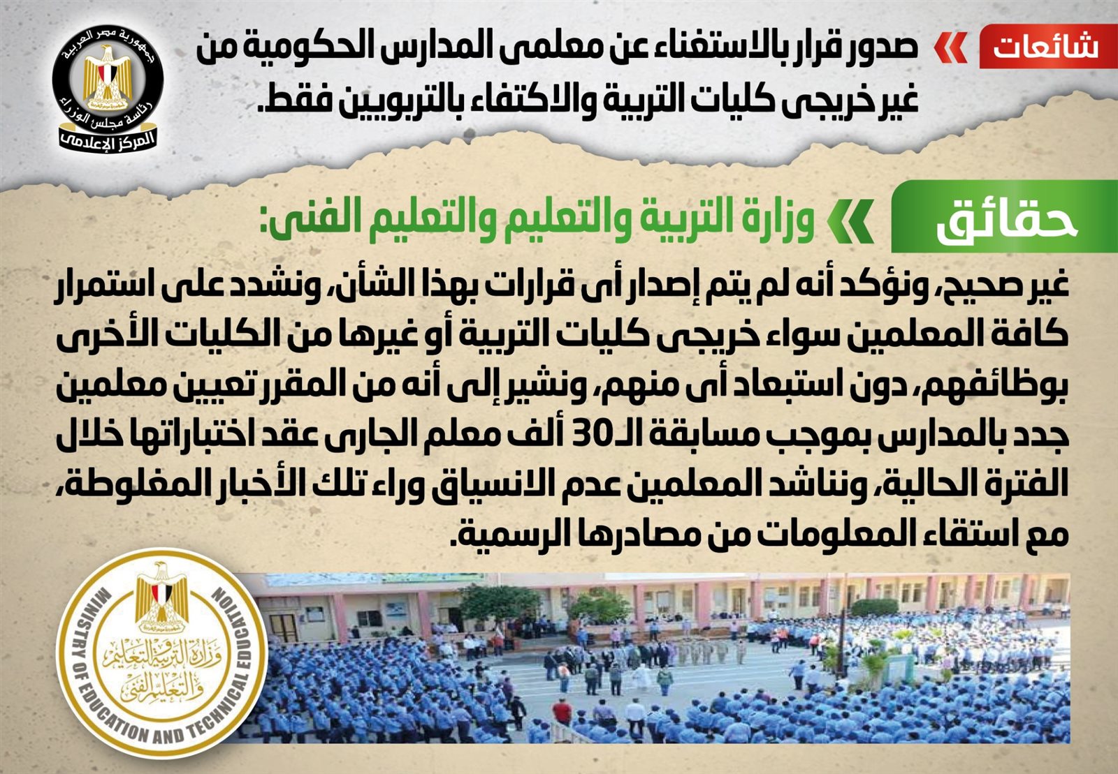 وتواصل المركز الإعلامي لمجلس الوزراء، مع وزارة التربية والتعليم والتعليم الفني، والتي نفت تلك الأنباء، مُؤكدةً أنه لا صحة للاستغناء عن أي من معلمي المدارس الحكومية من غير خريجي كليات التربية والاكتفاء بالتربويين فقط، وأنه لم يتم إصدار أي قرارات بهذا الشأن.
