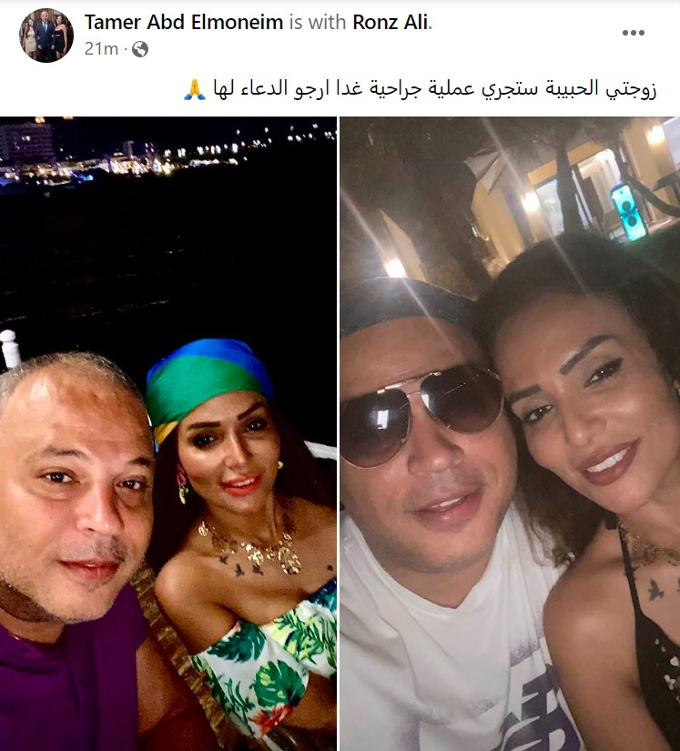 ونشر تامر عبد المنعم، صورتين تجمعه بزوجته، وذلك عبر حسابه الشخصي بموقع التواصل الاجتماعي فيسبوك، وكتب على الصور قائلًا: زوجتي الحبيبة ستجري عملية جراحية غدًا أرجو الدعاء لها.