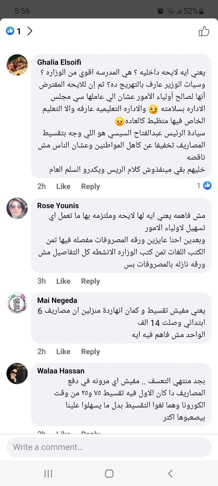 وكتبت روز يونس، ولية أمر، إحنا مش فاهمين يعني إيه لها لائحة داخلية تمنع التقسيط، مطالبة إدارة المدرسة بتوضيح المصروفات الدراسية بشكل مفصل بما يعني عايزين ورقة المصروفات مفصلة فيها تمن الكتب اللغات تمن كتب الوزارة الأنشطة كل التفاصيل مش ورقة نازلة بالمصروفات بس.