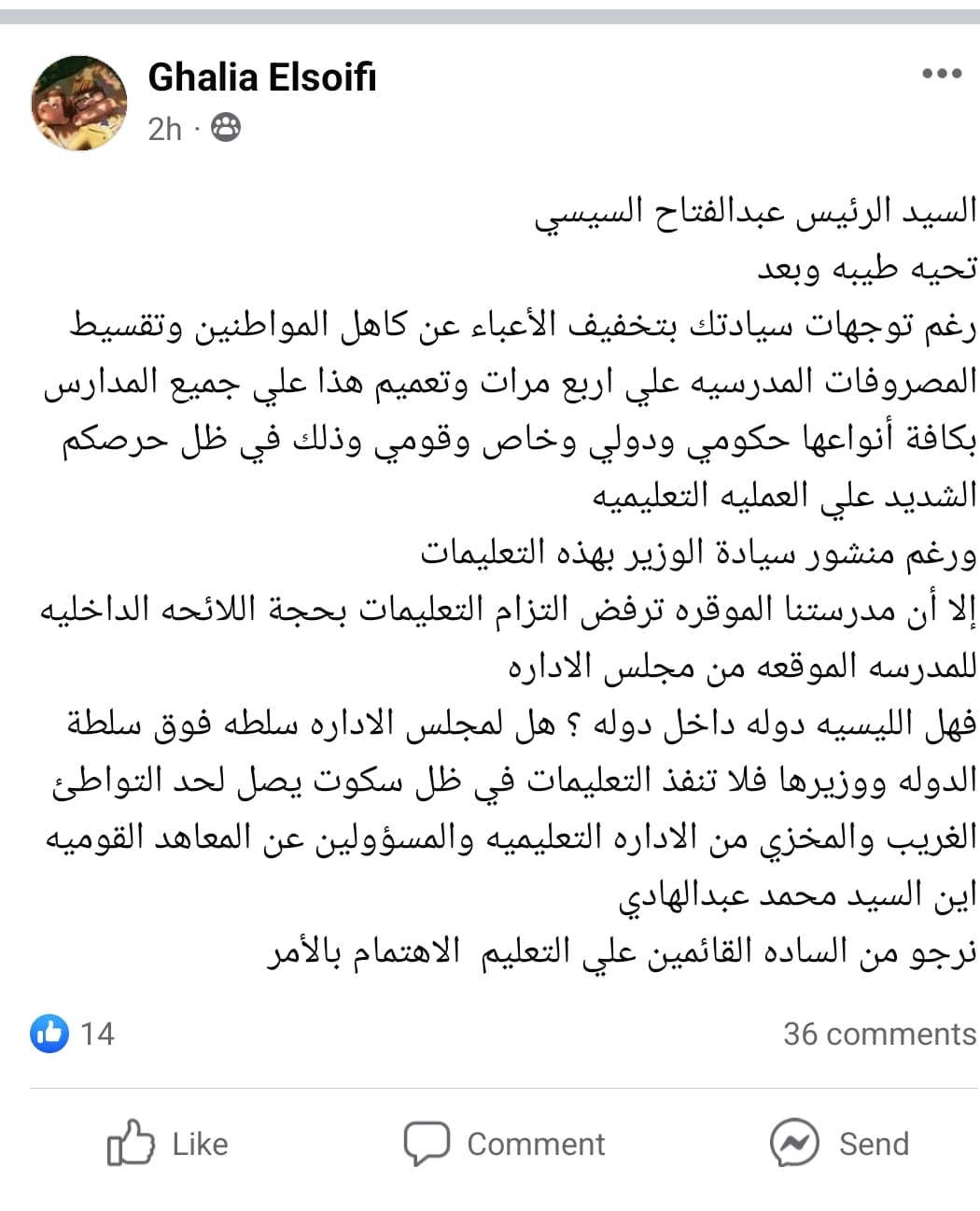 وكتبت غادة السويفي، ولية أمر عبر جروب أولياء أمور المدرسة: رغم توجهات الرئيس السيسي بتخفيف الأعباء عن كاهل المواطنين وتقسيط المصروفات المدرسية، وتعميم هذا على جميع المدارس بكافة أنواعها حكومي ودولي وخاص وقومي، وذلك في ظل حرصكم الشديد على العملية التعليمية، إلا أن مدرستنا الموقرة ترفض الالتزام بالتعليمات بحجة اللائحة الداخلية للمدرسة.