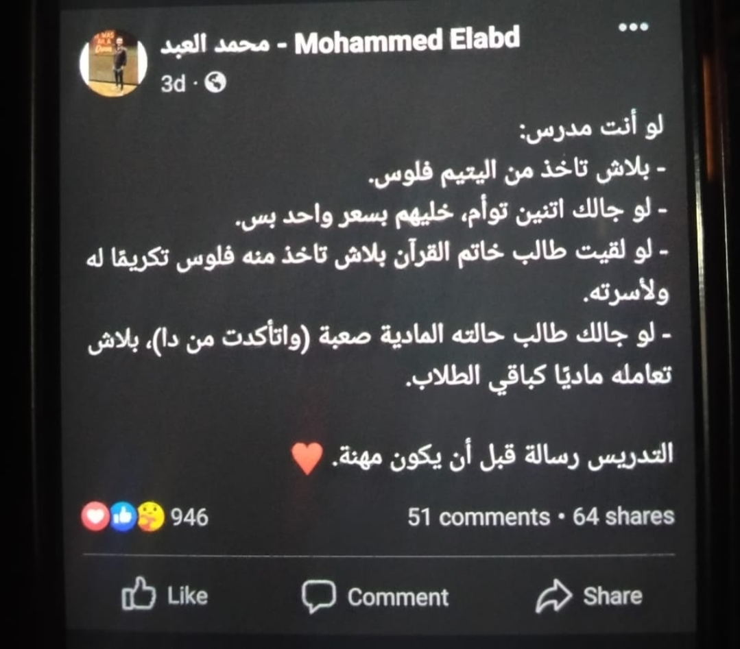 انتشر على مواقع التواصل الاجتماعي منشور لمعلم لغة عربية على موقع خلال توجيه لرسالة للمدرسين قائلا: لو انت مدرس بلاش تاخد من اليتيم فلوس، لو جالك اتنين توأم خليهم بسعر واحد بس، لو لقيت طالب خاتم القرآن بلاش تاخد منه فلوس تكريمًا له ولأسرته، لو جالك طالب حالته المادية صعبة بلاش تعامله ماديًا كباقي الطلاب، التدريس رسالة قبل أن يكون مهمة.