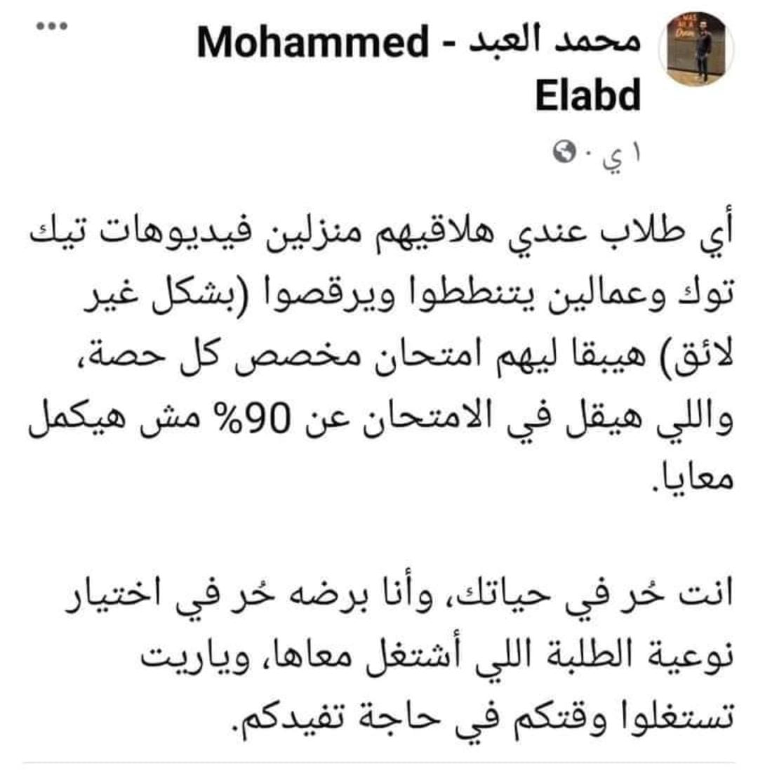 جدير بالذكر، أن تلك الرسالة لم تكن الرسالة الأولى اللافتة للانتباه للمعلم المذكور، حيث كتب المعلم على صفحته على فيس بوك خلال الساعات الماضية رسالة لافتة للانتباه لطلابه الذين لهم فيديوهات غير لائقة على برنامج التيك توك.