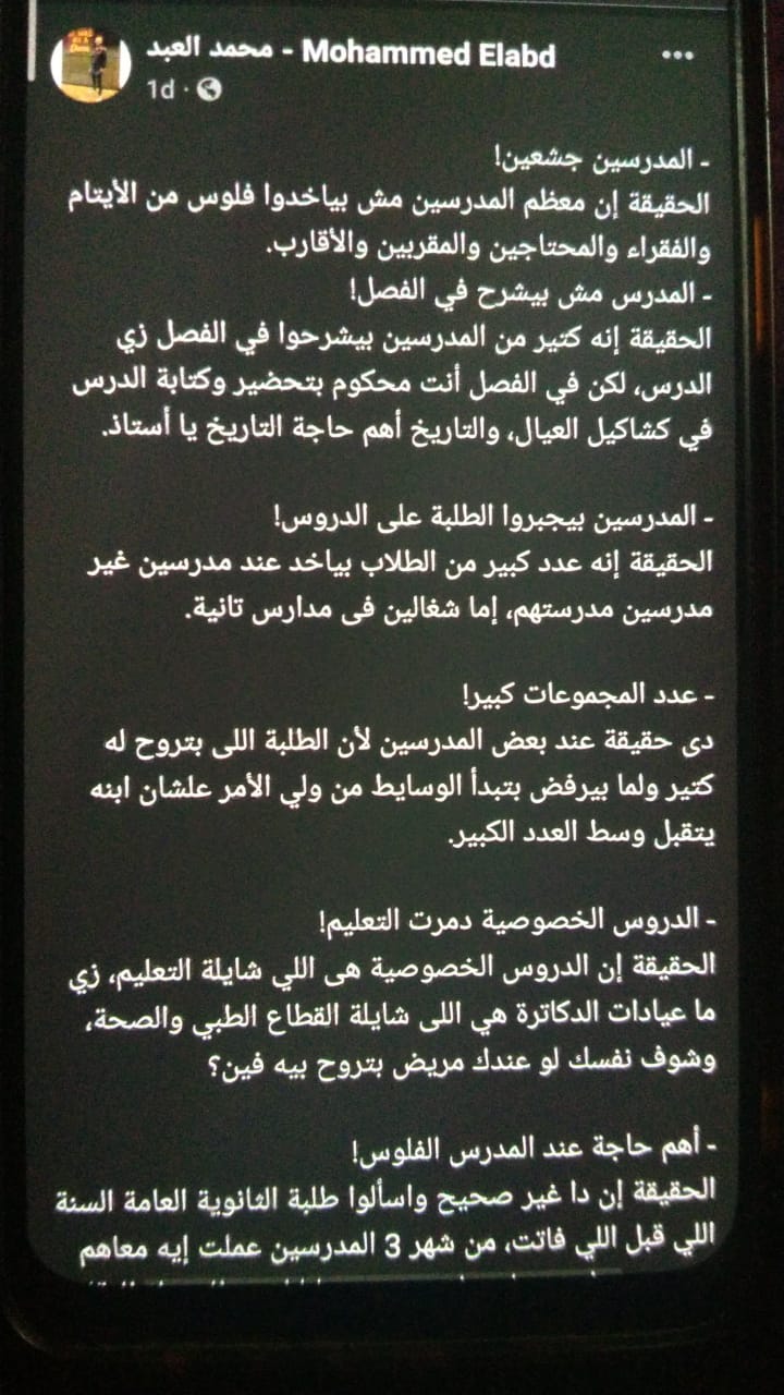 وتابع المدرس في منشور آخر، قائلا: الحقيقة إن معظم المدرسين مش بياخدوا فلوس من الأيتام والفقراء والمحتاجين والمقربين والأقارب، الحقيقة إن الدروس الخصوصية هى اللي شايلة التعليم، زي ما عيادات الدكاترة هي اللى شايلة القطاع الطبي والصحة، وشوف نفسك لو عندك مريض بتروح بيه فين؟