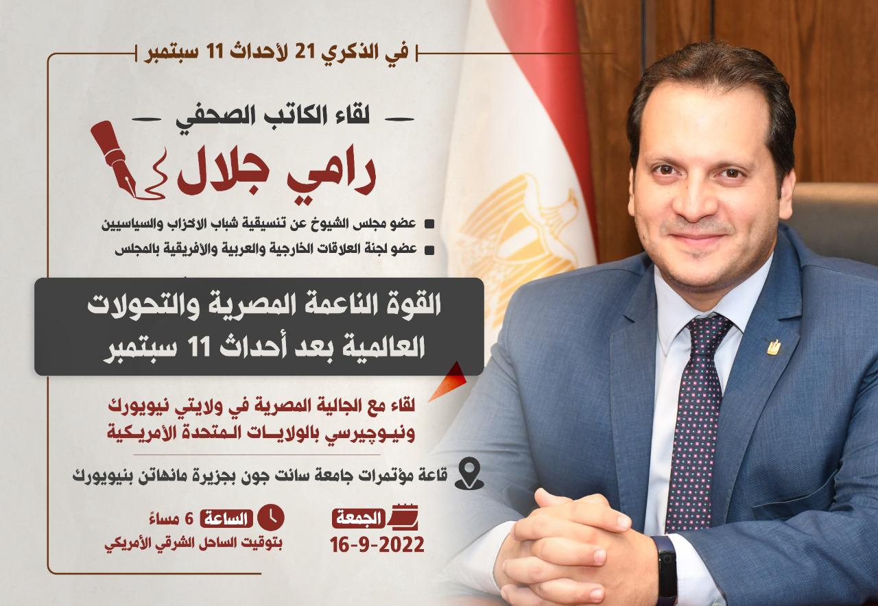 تنطلق بمدينة نيويورك الأمريكية، بعد غدٍ الجمعة، جلسة بعنوان: القوة الناعمة المصرية والتحولات العالمية بعد أحداث 11 سبتمبر، يقدمها الكاتب الصحفي رامي جلال، عضو مجلس الشيوخ عن تنسيقية شباب الأحزاب والسياسيين، وعضو اللجنة العامة ولجنة العلاقات الخارجية والعربية والإفريقية بالمجلس.