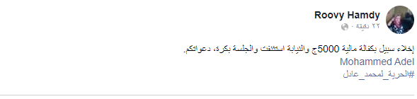 نشرت زوجة الناشط السياسي محمد عادل، القيادي السابق بحركة 6 أبريل، منشورًا على صفحتها الشخصية على موقع التواصل الاجتماعي، فيسبوك أكدت من خلاله أن جهات التحقيق قررت منذ قليل إخلاء سبيله، بكفالة مالية قدرها 5000جنيه، وجهات التحقيق تستأنف على القرار.