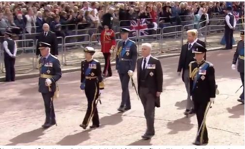 فيما ارتدى الملك تشارلز والأمير ويليام الزي العسكري الكامل، وسار ويليام خلف الملك وسار الأمير أندرو بجانب تشارلز، فيما ظل الأمير هاري في الخلف.