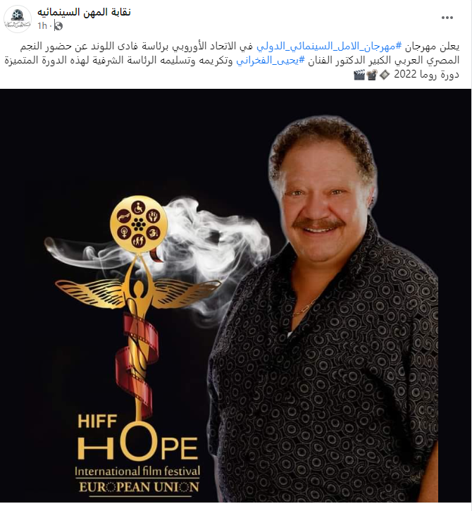 وأوضحت النقابة، عبر صفحتها الرسمية بـ فيس بوك، أنه جرى إهداء الرئاسة الشرفية لـ دورة روما 2022 للفنان يحيي الفخراني، حيث كتبت: يعلن مهرجان الأمل السينمائي الدولي في الاتحاد الأوروبي برئاسة فادى اللوند عن حضور النجم المصري العربي الكبير الدكتور الفنان وتكريمه وتسليمه الرئاسة الشرفية لهذه الدورة المتميزة دورة روما 2022.