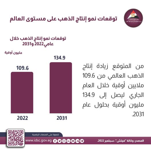 وذكر المركز الإعلامي لمجلس الوزراء، أنه من المتوقع أن يواصل إنتاج مناجم الذهب النموَ على مستوى العالم عام 2022، مع تلاشي التعطل الناتج عن جائحة فيروس كورونا، متابعًا: بحلول عام 2031، من المتوقع زيادة إنتاج الذهب ليصل إلى 134.9 مليون أوقية مقابل 109.6 ملايين أوقية عام 2022.
