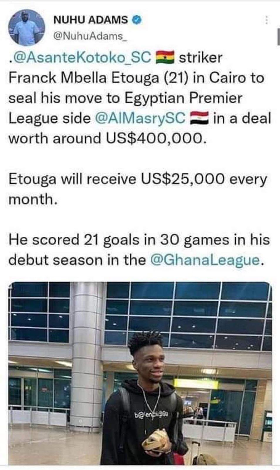 ويبلغ اللاعب الكاميروني فرانك إيتوجا 21 عامًا حيث وُلد في عام 2001، فيما شارك مع فريق أشانتي كوتوكو في 30 مباراة خلال الموسم الماضي، أحرز خلالها 22 هدفًا.