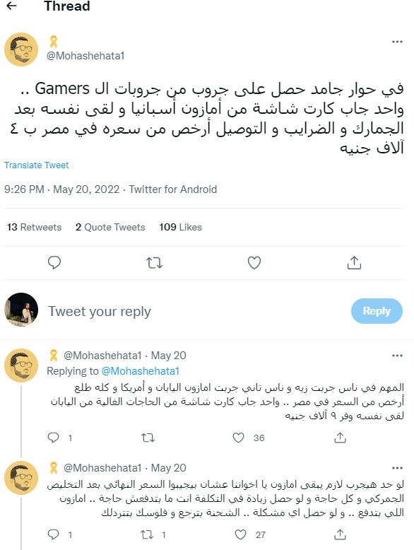 وذكر آخر: ولكن في بعض الناس استغلوا الحوار وخدوا الموضوع سبوبه، كل واحد بقى يشتري تسع ولا عشر كروت ويخلص على كل العروض ويبيعها هنا ويكسب فيها ألف ولا ألف ونص، المفروض إن أمازون ده للمستهلكين مش للتجار، يعني العروض دي بتتعمل علشان المستهلك العادي اللي هو فعلًا محتاج المنتج ده يلحق يشتري ويستفيد من العروض والخصومات، إنما أنت تاجر ومتهرب من الضرائب كمان وبتخلص على كل الكروت اللي هي المفروض موجهة للمستهلك، وطبعا لما الطلب بيزيد على منتج معين سعره بيزيد، وبالتالي لما يجي المستهلك يشتري كارت شاشه مثلًا هيلاقي سعره زاد والتاجر اللي خد كل القطع هو الوحيد اللي استفاد من العرض.