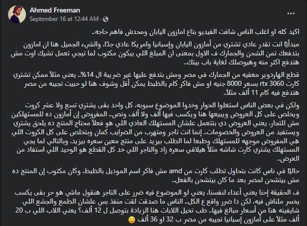 وأضاف: حاليًا في ناس كانت بتحاول تطلب كارت من amd نوع من أنواع كروت الشاشة، وكان مكتوب إن المنتج ده مش بيتشحن لمصر بعد ما كان بيتشحن بالفعل، ف الحقيقة إحنا يعني أعداء لنفسنا، يعني لو الموضوع فيه ضرر على التاجر هنقول ماشي هو حر بقى يكسب يخسر ملناش فيه، لكن دا ضرر واقع ع الكل، الناس ما صدقت لقت منفذ بس علشان الطمع والجشع اللي شايفينه هنا من أسعار مبالغ فيها، طب تخيل اللاب هنا الزيادة بتوصل لـ 12 ألف، يعني اللاب اللي بـ 20 ألف مثلًا على أمازون اليابان تجيبه من مصر بـ 32 او 36 ألف.