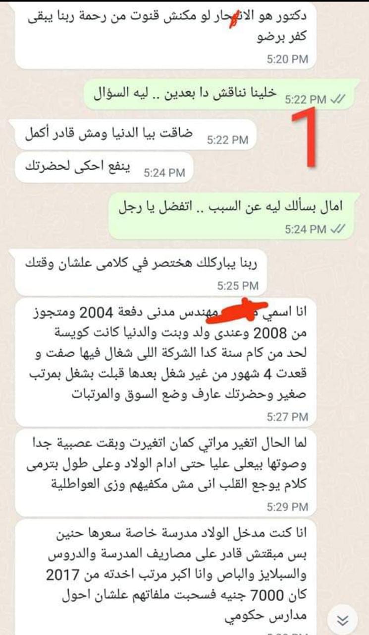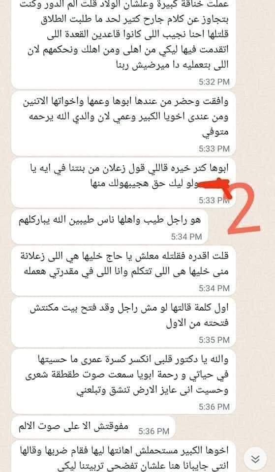 وأكمل المهندس قصته قائلًا إن شقيق زوجته هم بضربها فور معرفته سبب طلاق شقيقته، لكن ما جاء له من الأب كان ضربة موجعة لقلبه -حسبما وصف- حيث قال: أول كلمة قالها أبوها لو مش راجل وقد فتح بيت مكنتش فتحته من الأول، والله يا دكتور قلبي اتكسر كسرة عمري ما حسيتها في حياتي، ورحمة أبويا سمعت صوت طقطقة شعري وإني عايز الأرض تنشق وتبلعني.