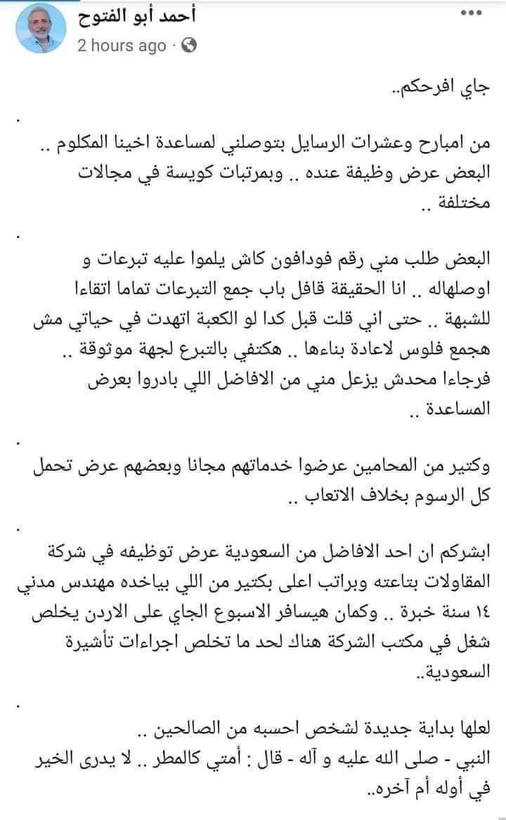 القصة التي لم يتم التأكد من صحتها، أصبحت حديث السوشيال ميديا، وهناك من أكد أنها خُرافة مجرد تأليف وقصة خيالية، والبعض الآخر استشهد بقصص أكثر بشاعة منها، لكن الغريب، هو تسارع أصحاب الشركات لتوفير عمل للشاب المجهولة هويته حتى الآن، هذا بجانب المحامين الذين عرضوا عليه الترافع عنه أمام زوجته دون أتعاب، حتى كشف أحمد الفتوح أنه سيتم توظيفه بشركة للمقاولات في السعودية براتب جيد، كما أنه سيسافر الأسبوع القادم إلى الأردن.