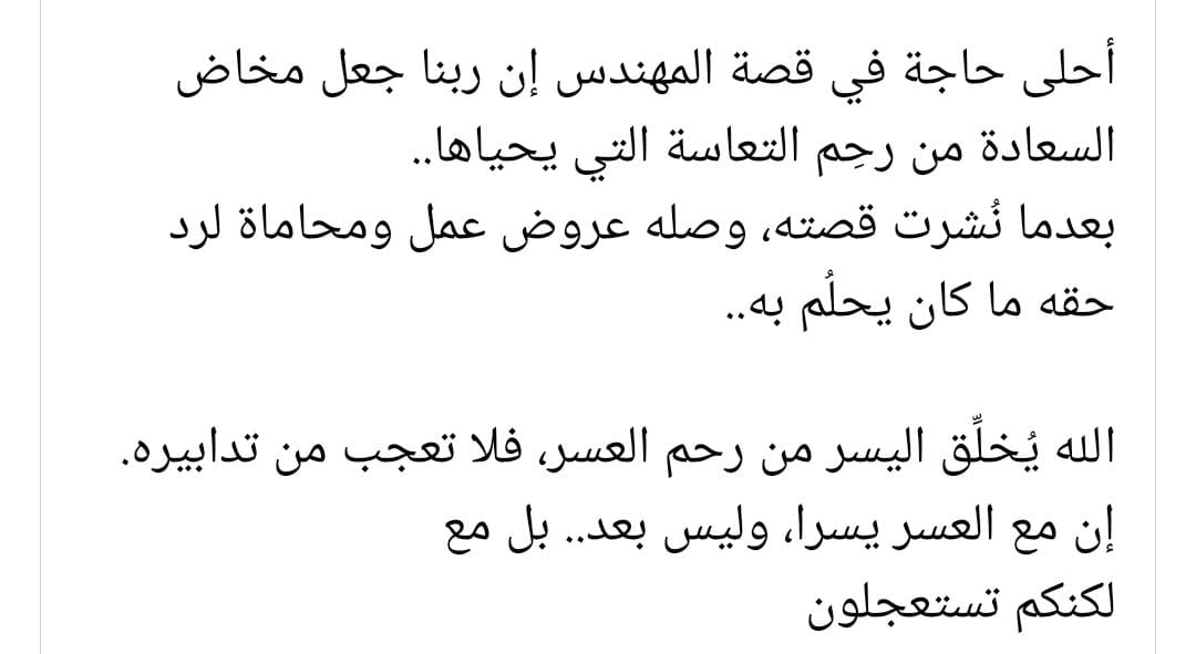 وبدأ المهندس المدني في سرد قصته، وحسبما جاء في المنشور الذي لم يذكر اسمه به، أنه متزوج ولديه ولد وابنة وكان راتبه يكفي بيته بشكل مريح، إلا أن شركته قررت تصفية الموظفين ومكث في المنزل شهورا دون عمل، إلى أن وجد عملًا آخر ولكن براتب أقل.