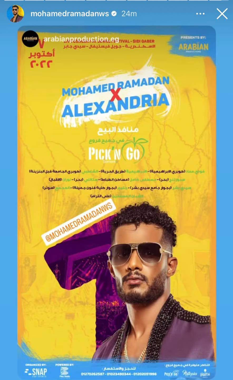 ونشر محمد رمضان، بوستر بمناطق حجز التذاكر، مؤكدًا إقامة الحفل في موعده، وذلك عبر خاصية ستورى على حسابه الشخصي بموقع إنستجرام.