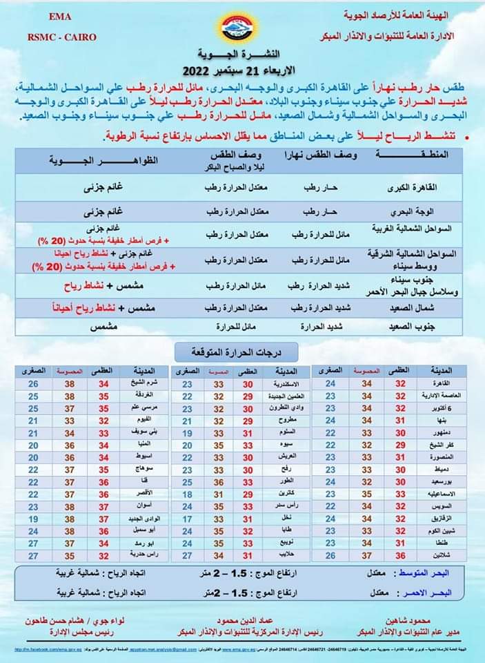 وتابعت: يسود طقس حار رطب، خلال فترات على القاهرة الكبرى والوجه البحري والسواحل الشمالية، شديد الحرارة على جنوب سيناء وجنوب البلاد.