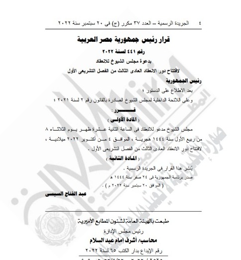 دعا الرئيس عبد الفتاح السيسي، مجلس الشيوخ للانعقاد يوم الثلاثاء 4 أكتوبر المقبل، وذلك لافتتاح دور الانعقاد العادي الثالث من الفصل التشريعي الأول