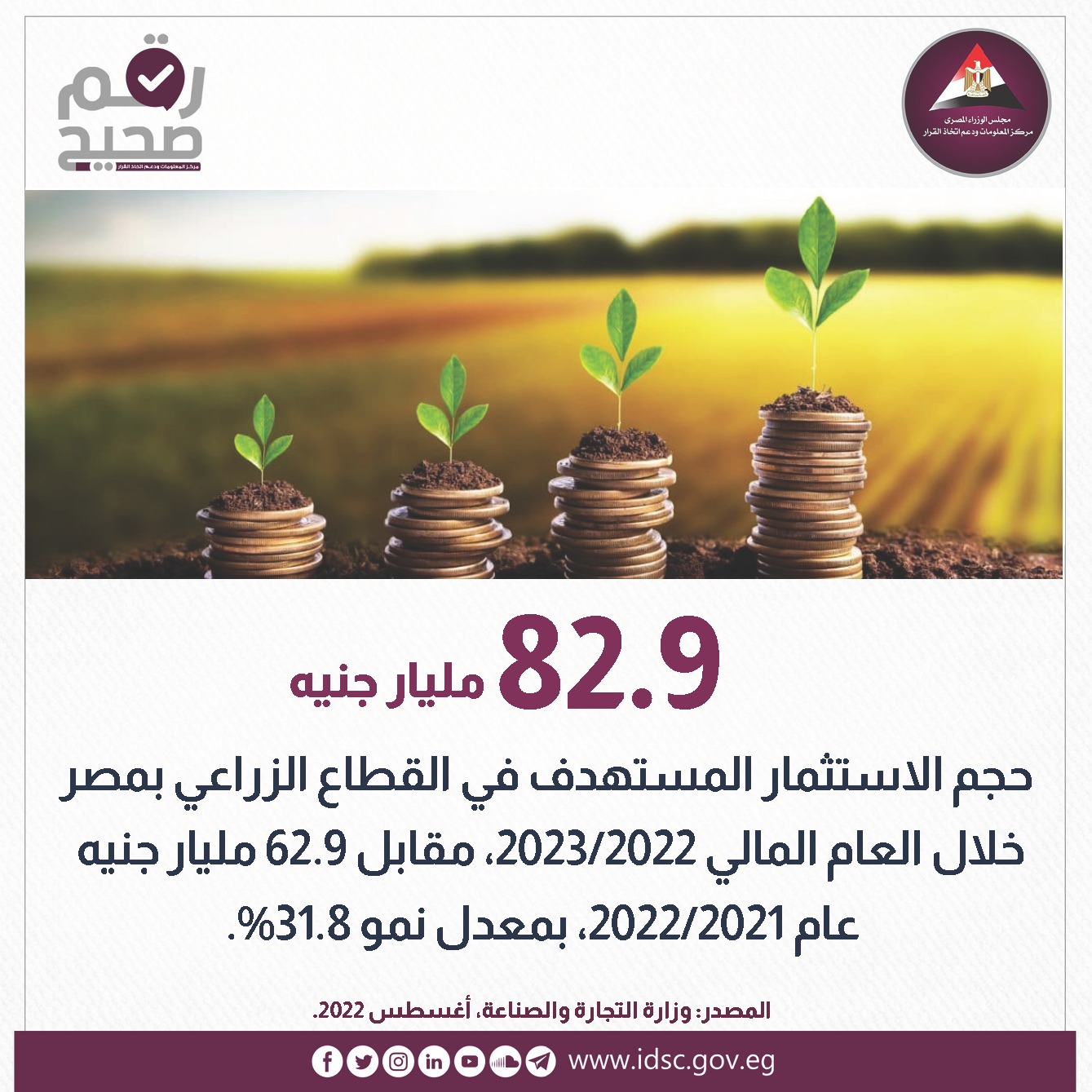نشرت الصفحة الرسمية لمركز المعلومات ودعم اتخاذ القرار التابع لمجلس الوزراء، انفوجراف، سلطت من خلاله الضوء على قطاع الزراعة والري، لافتة أن مصر تستهدف استثمار حوالي 82.9 مليار جنيه في القطاع الزراعي خلال العام المالي 2022/2023.