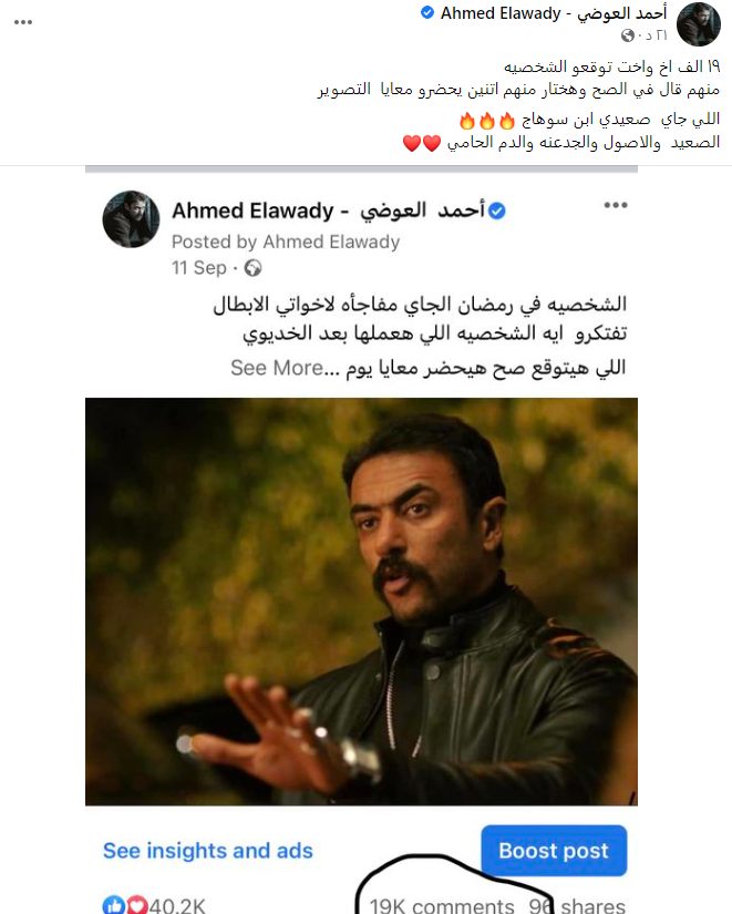 وكتب العوضي عبر حسابه بموقع فيس بوك: 19 ألف أخ وأخت توقعوا الشخصية، منهم قال في الصح وهختار منهم اتنين يحضروا معايا التصوير، مضيفًا: اللي جاي صعيدي ابن سوهاج، الصعيد والأصول والجدعنة والدم الحامي.