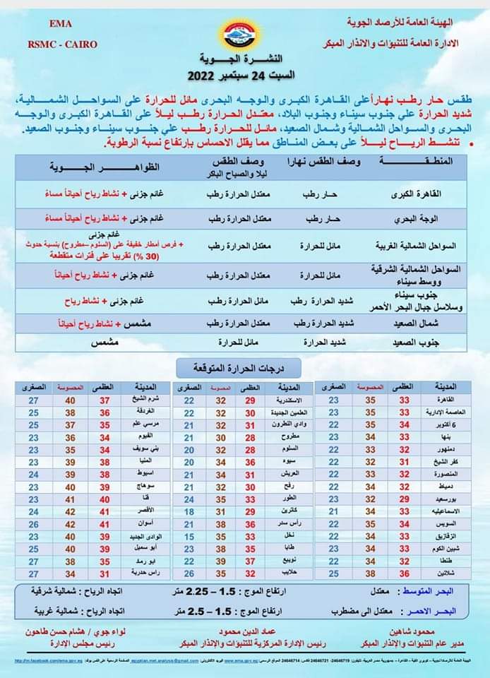 أعلنت هيئة الأرصاد الجوية، تفاصيل حالة الطقس التي تشهدها البلاد اليوم السبت 24 سبتمبر، موضحة درجات الحرارة المتوقعة.