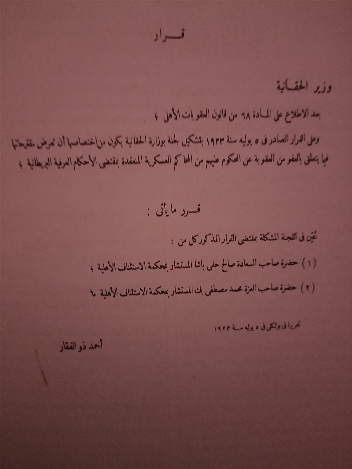 قرار بتعيين عضوين بلجنة نظر الأحكام العسكرية عام 1923