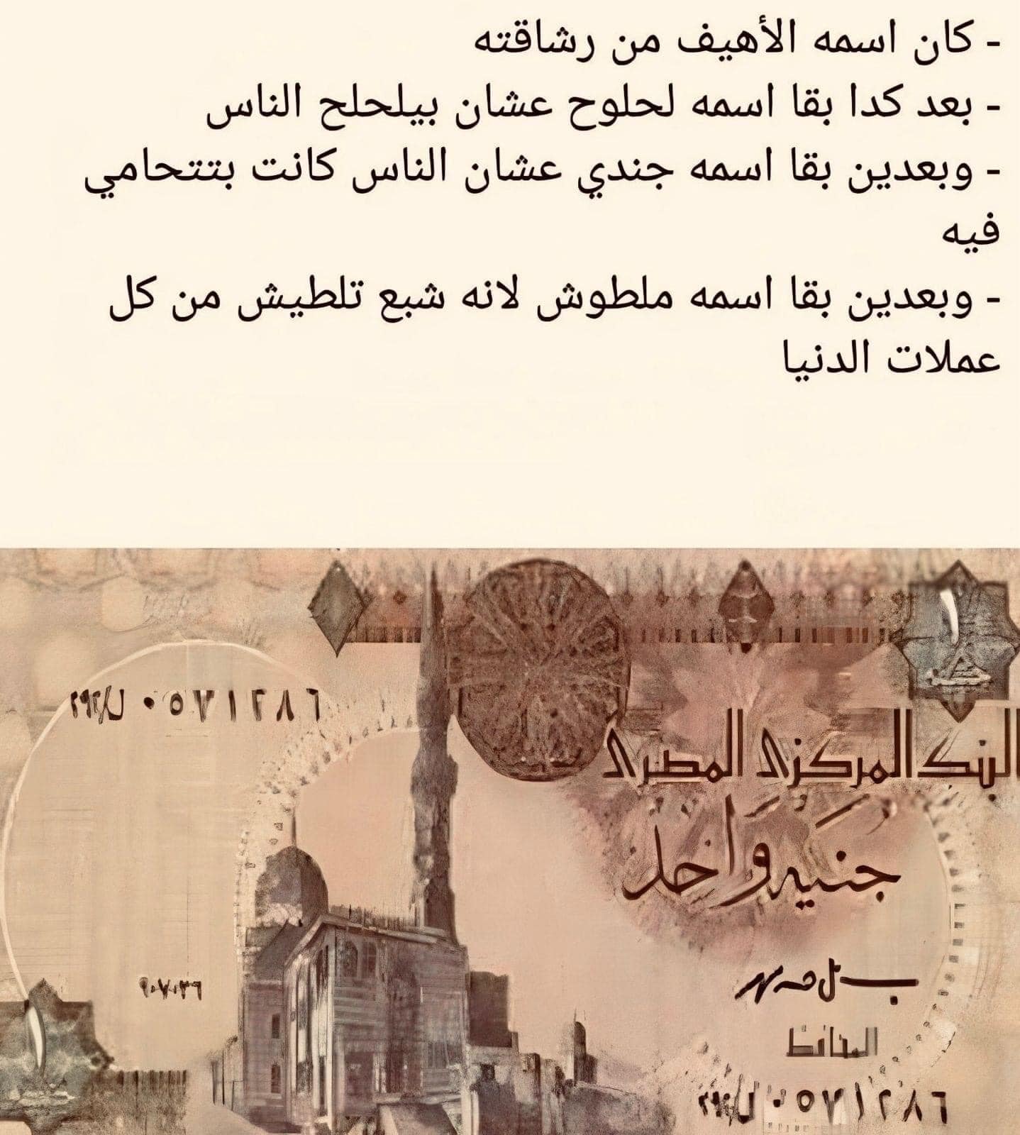 وتداول مستخدمو موقع التواصل الاجتماعي فيسبوك، صورة تحاكي الألقاب اللي حصل عليها الجنيه المصري بطريقة ساخرة.