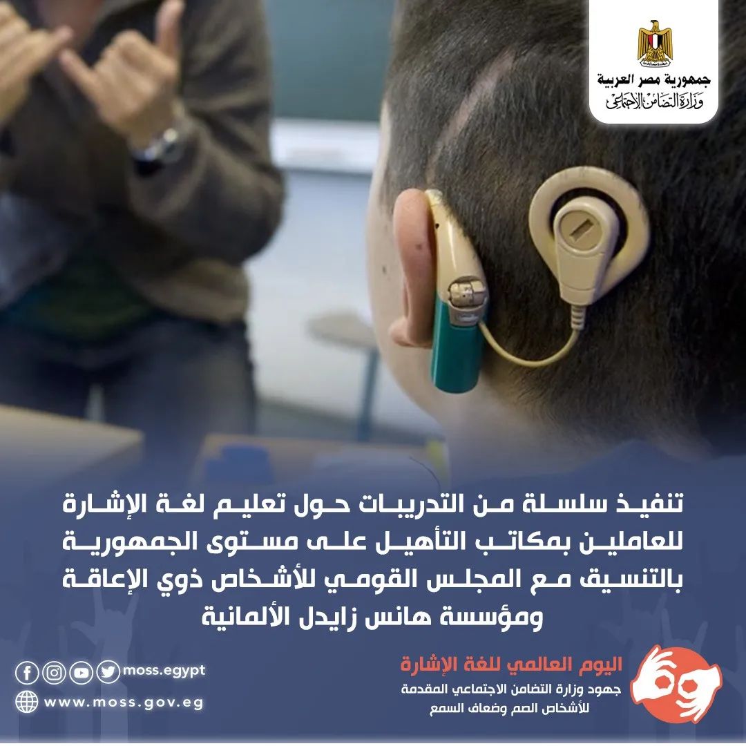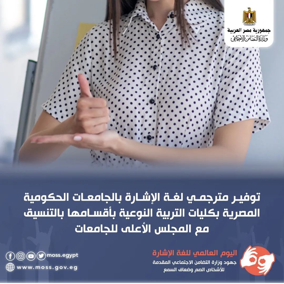 وقالت وزارة التضامن الاجتماعي، في منشورها، إن الوزارة وفرت مترجمي لغة الإشارة بالجامعات الحكومية المصرية بكليات التربية النوعية بأقسامها بالتنسيق مع المجلس الأعلى للجامعات، بالإضافة إلى تنفيذ سلسلة من التدريبات حول تعليم لغة الإشارة للعاملين بمكاتب التأهيل على مستوى الجمهورية بالتنسيق مع المجلس القومي للأشخاص ذوي الإعاقة ومؤسسة هانس زايدل الألمانية، بجانب توفير مترجمي لغة الإشارة للعمل بقنوات إخبارية لترجمة النشرات الإخبارية.