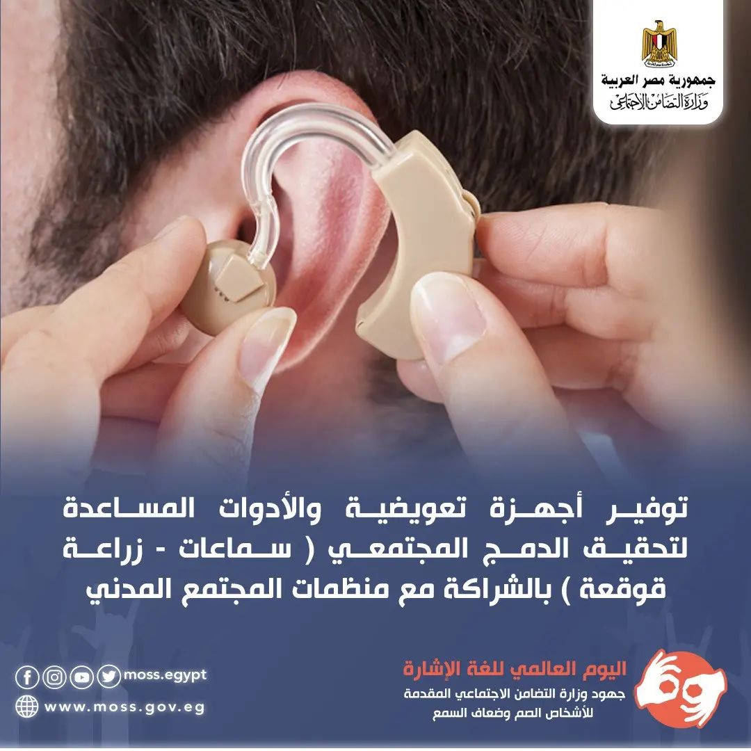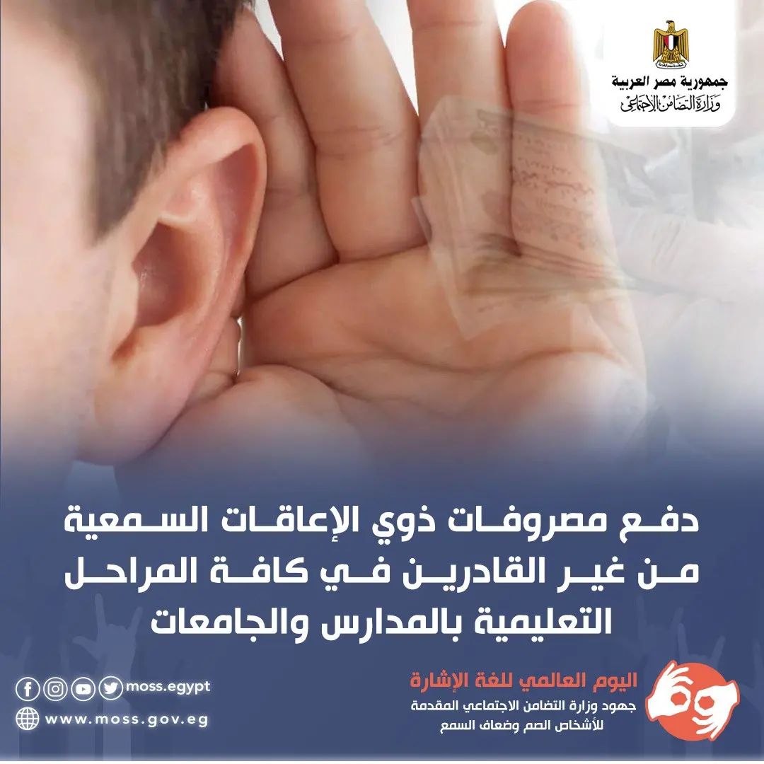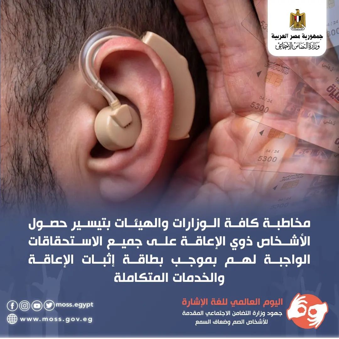 وأكدت وزارة التضامن الاجتماعي، أنها دفعت مصروفات ذوي الإعاقات السمعية من غير القادرين في كافة المراحل التعليمية بالمدارس والجامعات، علاوة على توفير أجهزة تعويضية والأدوات المساعدة لتحقيق الدمـج المجتمعي «سماعات - زراعـة قوقعة» بالشراكة مع منظمات المجتمع المدني، بالإضافة إلى مخاطبة كافـة الوزارات والهيئات بتيسير حصول الأشخاص ذوي الإعاقة على جميع الاستحقاقات الواجبة لهم بموجب بطاقة إثبات الإعاقة والخدمات المتكاملة.