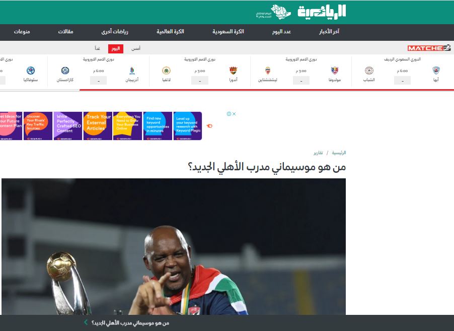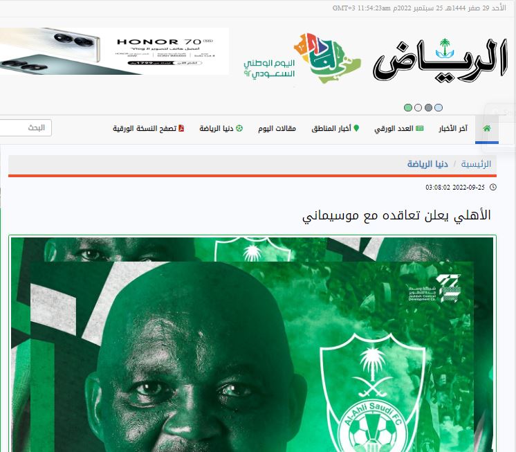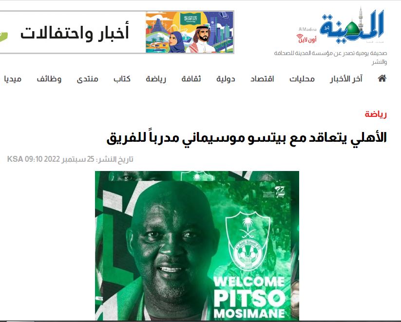 نشرت صحيفة الرياض خبر تعاقد أهلي جدة مع بيتسو موسيماني، وقالت إنه يمتلك ألقابا مميزة، في مسيرته التدريبية، حيث حقق 14 لقبًا مع صن داونز والأهلي، وفاز مسبقًا بجائزة أفضل مدرب إفريقي.