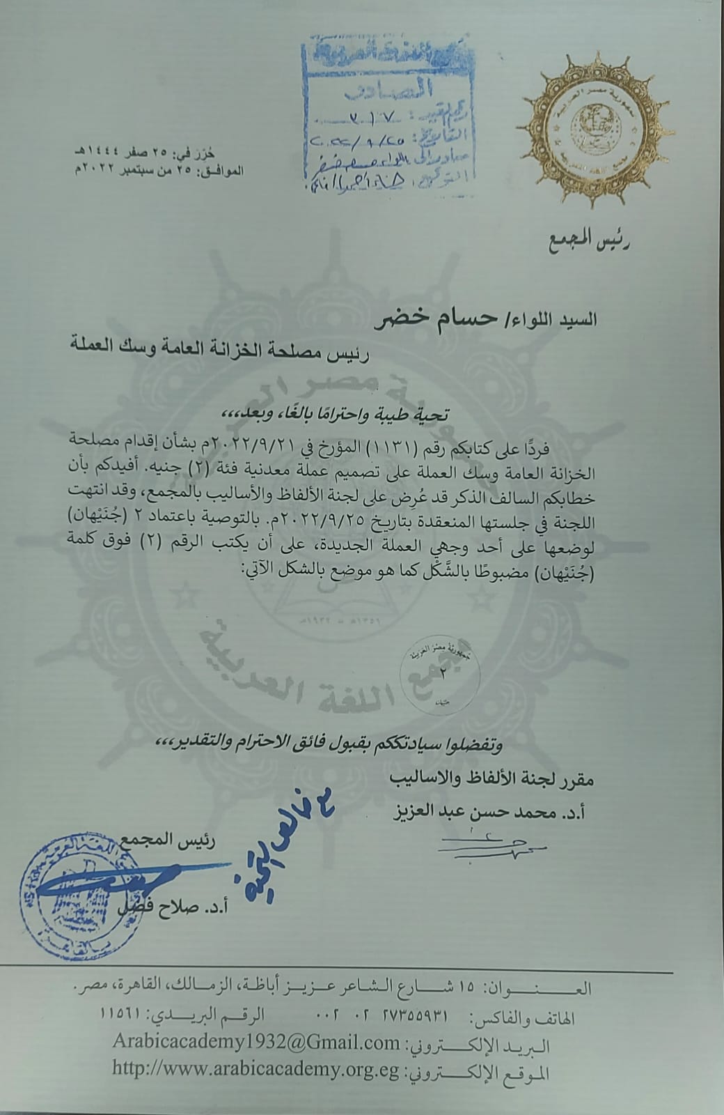 رد مجمع اللغة العربية برئاسة الدكتور صلاح فضل على استفتاء مصلحة الخزانة العامة وسك العملة حول الكتابة اللغوية الصحيحة لكلمة «2 جنيه».