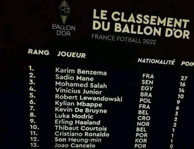 وتواجد محمد صلاح في المركز الثالث بالقائمة المسربة لجائزة البالون دور، خلف المتصدر كريم بنزيما نجم فريق ريال مدريد الإسباني، والنجم السنغالي ساديو ماني المنتقل حديثًا لصفوف بايرن ميونيخ الألماني.