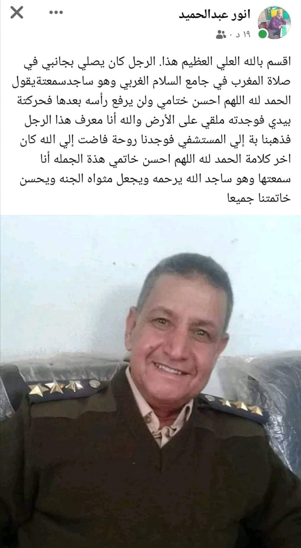 ونشر أنور عبد الحميد، الذي كان يؤدي صلاة المغرب بجانب الفقيد بالمسجد، عبر حسابه على موقع التواصل الاجتماعي "فيسبوك" صورة الفقيد وكتب "أقسم بالله العلى العظيم هذا الرجل كان يصلي بجانبي في صلاة المغرب في جامع السلام الغربي، وهو ساجد سمعته يقول الحمد لله اللهم أحسن ختامي، ولم يرفع رأسه بعدها فحركته بيدي فوجدته ملقي على الأرض".