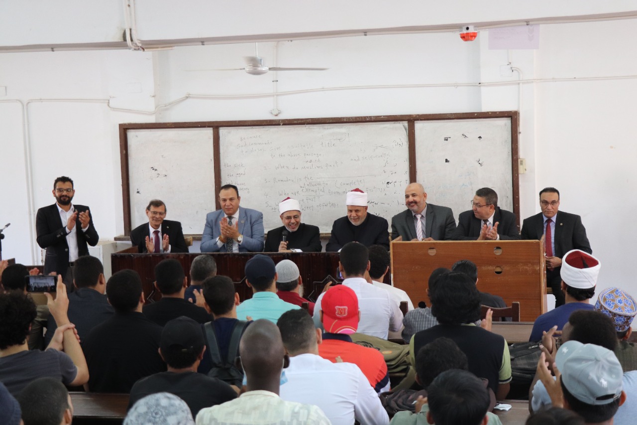 وقال رئيس الجامعة للطلاب: لكم الحق أن تفخروا بانتسابكم لمؤسسة الأزهر الشريف، برئاسة فضيلة الإمام الأكبر الدكتور أحمد الطيب، شيخ الأزهر الشريف، وعليكم أن تحملوا رسالته الوسطية المعتدلة إلى جميع أرجاء الدنيا، وعليكم أن تعملوا بما تتعلموا، وأن تتفقهوا فيما تقرأوا، ومن فضل الله علينا أن كلياتكم تزخر بالعلماء، وطالبهم أن يجددوا العزيمة والنية في أخذ العلم، وعدم التكاسل.