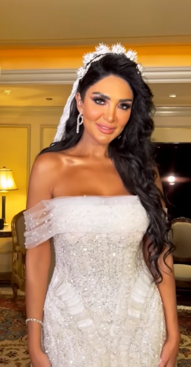 وظهرت سالي عبد السلام بفستان أبيض طويل مطرز وشعر منسدل وطرحة طويلة، ومكياج وإكسسوارات بسيطة أظهرت جمال ملامحها.
