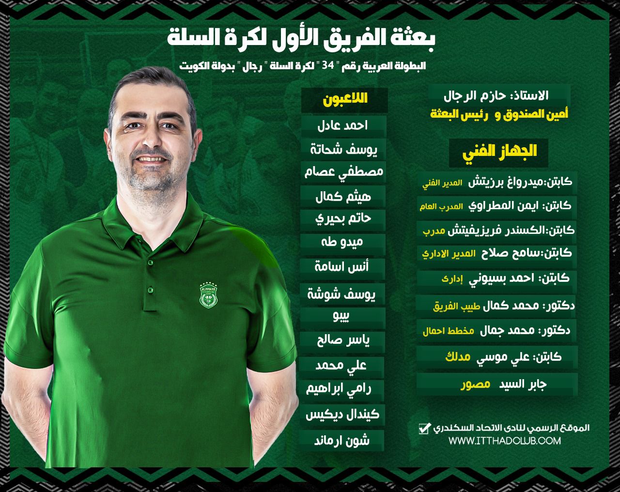 تغادر غدا بعثة الفريق الأول لكرة السلة بنادي الاتحاد السكندري برئاسة حازم الرجال أمين صندوق النادي متجهة إلى دولة الكويت الشقيقة للمشاركة فى البطولة العربية رقم "34" لكرة السلة "رجال"، والتى وينظمها نادى الكويت الكويتى خلال الفترة من 5 إلى 15 أكتوبر القادم.
