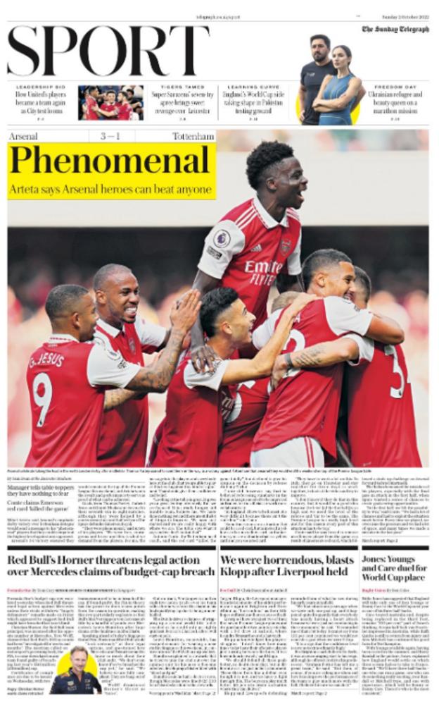 عنونت تيليجراف في غلافها اليوم بـ ظاهرة، حيث قالت، إن فريق أرسنال يمكنه الفوز على أي منافس، حسب قول ميكيل أرتيتا مدرب الفريق.