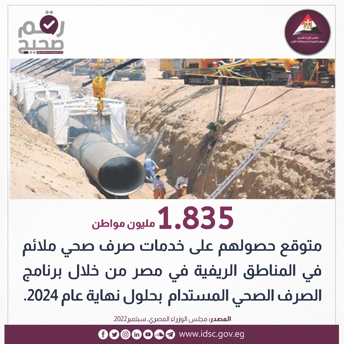نشر المركز الإعلامي لمجلس الوزراء، انفوجرافًا جديدًا على صفحته الشخصية على موقع التواصل الاجتماعي “فيسبوك”: سلط الضوء من خلاله على عدد المواطنين المتوقع حصولهم على خدمات الصرف الصحي في المناطق الريفية في مصر، وذلك من خلال برنامج الصرف الصحي المستدام بحلول نهاية عام 2024، متوقعًا أن يصل عددهم إلى 1.835 مليون مواطن.