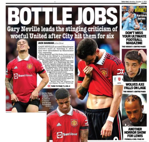 وقالت ديلي ميل، في غلافها اليوم، إن لاعبي مانشستر يونايتد كانوا مثل الزجاجة في مباراة الأمس أمام مانشستر سيتي، ولم يقدموا أي أداء، في ظل خسارتهم بستة أهداف مقابل ثلاثة على ملعب الاتحاد.