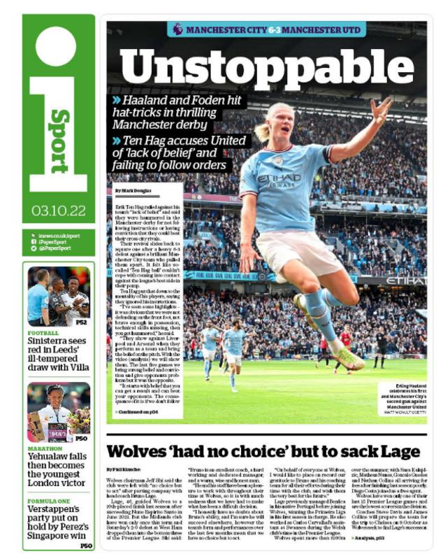 بينما قالت صحيفة I sport الإنجليزية، في غلافها، أن إيرلينج هالاند لاعب مانشستر سيتي غير قابل للإيقاف، وذلك بعد تسجيله هاتريك، وقيادته لفريقه من أجل إسقاط وتدمير مانشستر يونايتد بسداسية في الديربي.