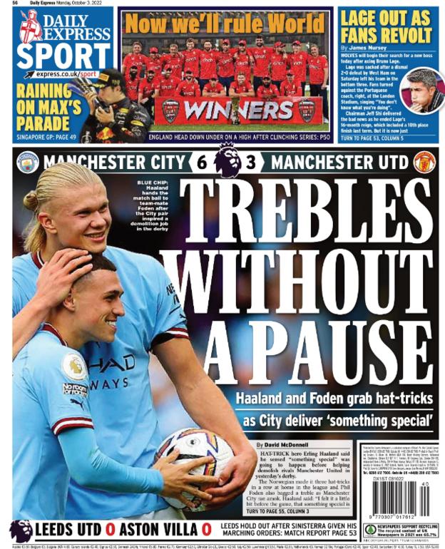 وتصدر الثنائي إيرلينج هالاند وفيل فودين غلاف صحيفة إكسبريس لعدد اليوم، حيث عنونت بـ ثلاثيات غير قابلة للإيقاف، وذلك بعد أن سجل كلاهما هاتريك في شباك مانشستر يونايتد أمس.