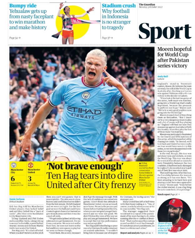 وعنونت جارديان في غلافها بـ غير شُجعان بشكل كافي، وذلك بعد تصريح إريك تين هاج مدرب الفريق عن تراجع أداء لاعبي الشياطين الحُمر أمام مانشستر سيتي، عقب الخسارة بسداسية.