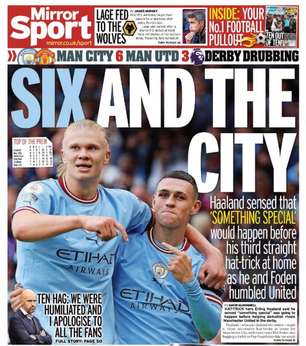 وعنونت صحيفة ميرور في غلافها اليوم بـ سداسية والمدينة، حيث أشارت إلى أن إيرلينج هالاند سجل هاتريك 3 مرات على التوالي في ملعب الاتحاد، ونجح في قيادة فريقه للفوز بالديربي بسهولة أمام يونايتد.