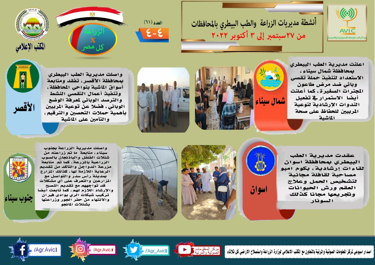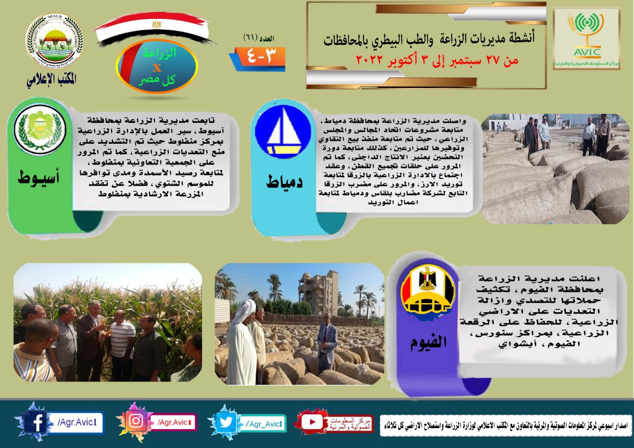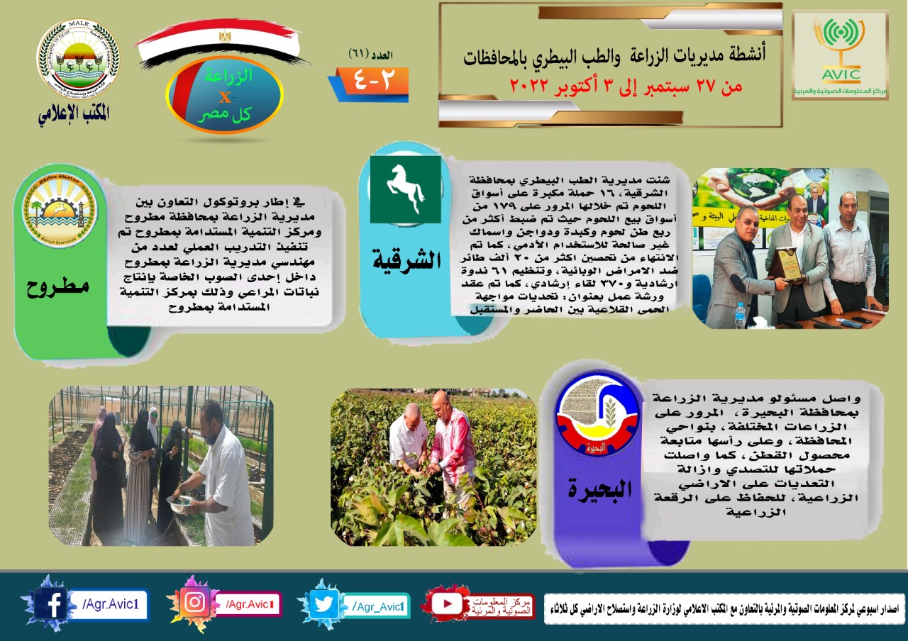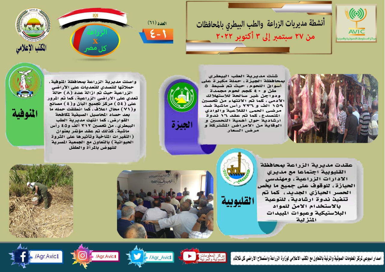 أصدر مركز المعلومات الصوتية والمرئية التابع لوزارة الزراعة واستصلاح الأراضي، والمكتب الإعلامي للوزارة، العدد رقم 61 من إصدار: الزراعة في كل مصر، يوضح الجهود والأنشطة التي تقوم بها مديريات الزراعة والطب البيطري بمحافظات الجمهورية خلال الفترة من 27 سبتمبر وحتى 3 أكتوبر الجاري.