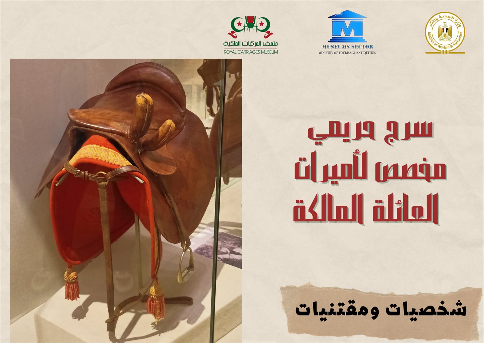 - سرج حريمي كبير الحجم مخصص للأميرات والملكات يوضع على ظهر الحصان حيث كان يستخدم أثناء التنزه، حيث كانت الأميرات يركبن على السرج وهن يرتدين فستان طويل ويجلسن على جانب واحد من السرج وكلتا الساقين بجانب بعضهما وذلك أثناء قيادة الحصان كما هو الحال في صورة الأميرة فائقة ابنة الخديوي اسماعيل بالتبني، وكان يقوم بقيادة الحصان أحد السياس أو الأميرة بنفسها، والسرج مصنوع من ( جلد، نسيج، معدن) ويُعرض بقاعة الحصان.