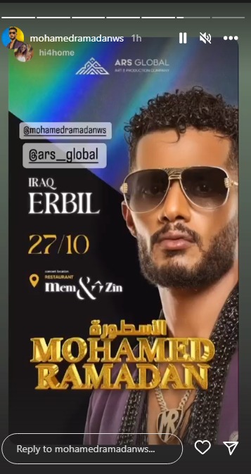 كشف الفنانمحمد رمضان، بوستر حفله الجديد المقام في مدينة أربيل بالعراق وذلك بعد إلغاء حفله في مصر الذي كان من المقرر إقامته في مدينة الإسكندرية، وقبلها أيضا تم إلغاء حفله في سوريا من قِبل نقابة الفنانين السورية.