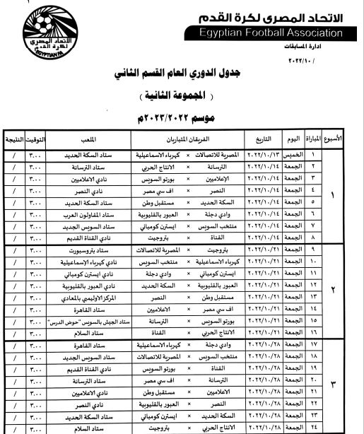 نشر الاتحاد المصري لكرة لقدم جدول مباريات الجولة الأولى من عمر مسابقة دوري الدرجة الثانية للموسم الجديد 2022-2023، في الثلاث مجموعات، والمقرر إقامتها أيام الأربعاء 12 أكتوبر، الخميس 13 أكتوبر، الجمعة 14 أكتوبر.
