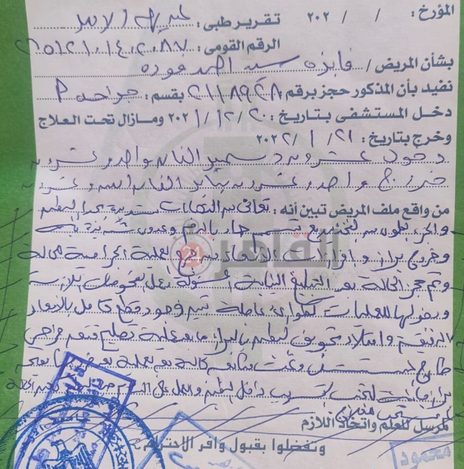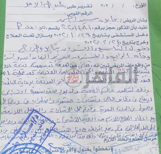 وجاء في التقرير الطبي الصادر عن مستشفى الحسين الجامعي، أن السيدة المتوفية وصلت إلى الطوارئ وهي تعاني من التهابات شديدة وتسمم حاد في الدم، وعدوى شديدة وخروج براز وإفرازات الأمعاء من جرح العملية التي أجرتها خارج المستشفى.