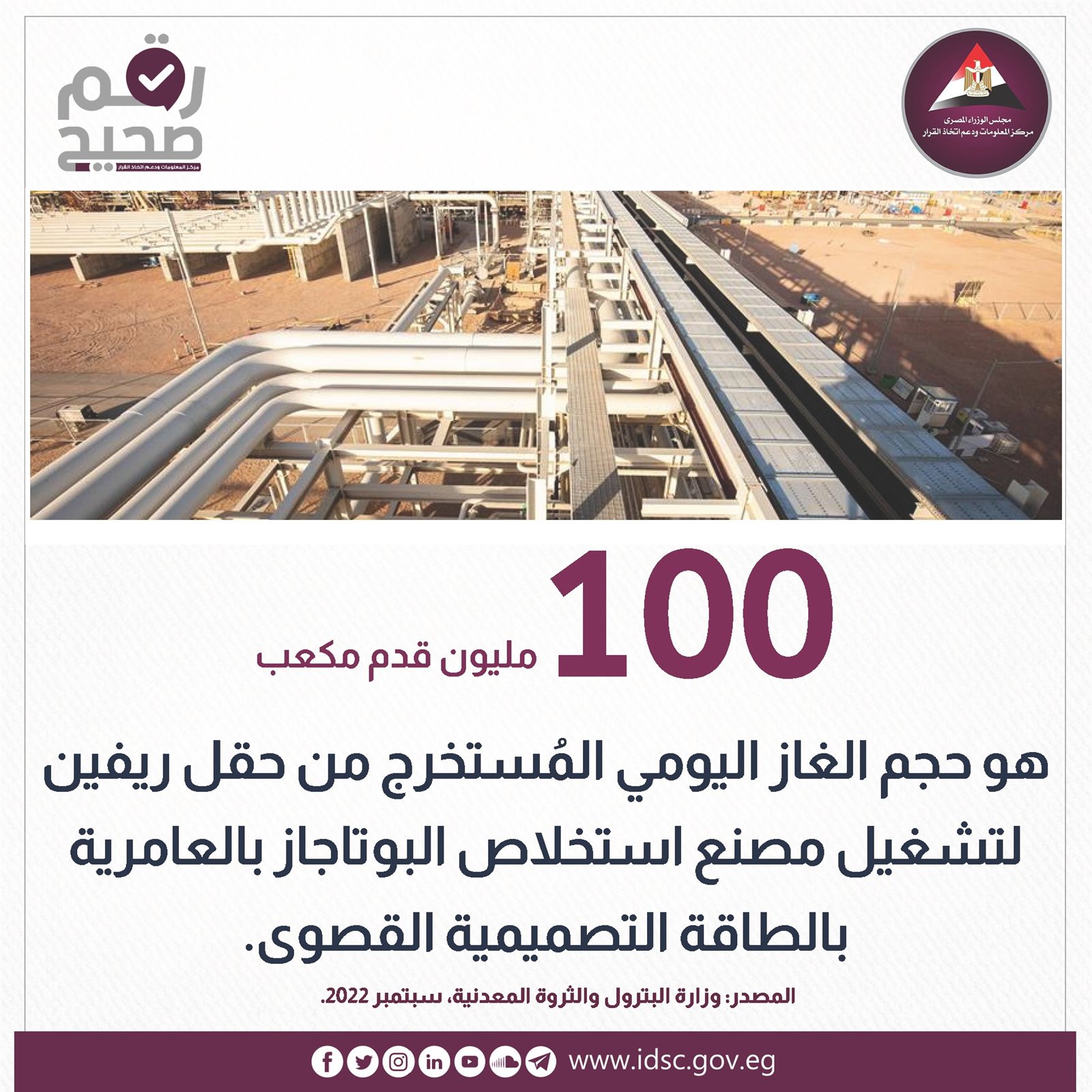 نشر المركز الإعلامي لمجلس الوزراء، انفوجرافًا على صفحته الشخصية على موقع التواصل الاجتماعي، “فيسبوك”: سلط من خلاله الضوء على حجم الغاز اليومي المستخرج من حقل ريفين لتشغيل مصنع البوتاجاز بالعامرية بالطاقة التصميمية القصوى، متابعًا أنه وصل إلى 100 مليون قدم مكعب.