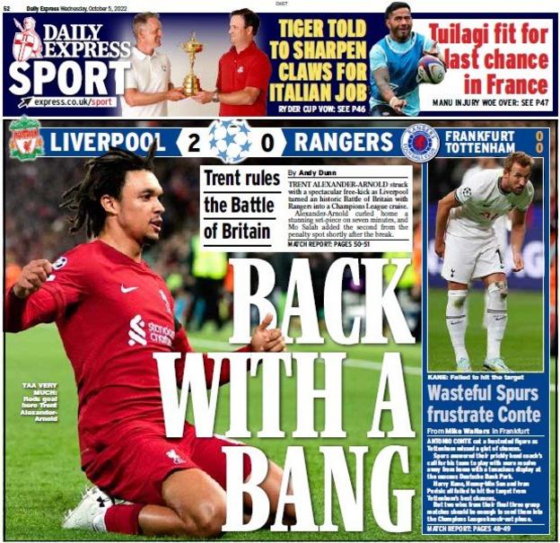 تصدر ترنت ألكسندر أرنولد لاعب فريق ليفربول غلاف صحيفة إكسبريس لعدد اليوم، حيث قالت إن نجم الريدز قد عاد إلى أدائه المطلوب بعد مباراة مميزة دفاعيًا وهجوميًا مع ليفربول أمس.