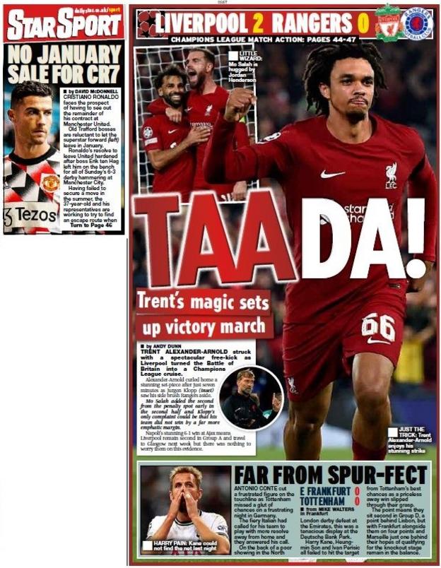 عنونت ديلي ستار في غلافها اليوم بـ يوم ترنت ألكسندر أرنولد.. سحر نجم ليفربول يجلب الفوز في آنفيلد، كما سلطت الصحيفة الضوء على تطورات مستقبل كريستيانو رونالدو، وذلك بعد الأنباء التي انتشرت حول اقتراب رحيله في شهر يناير المقبل.
